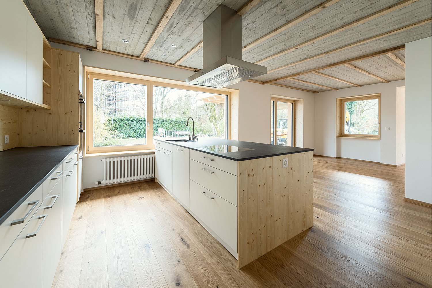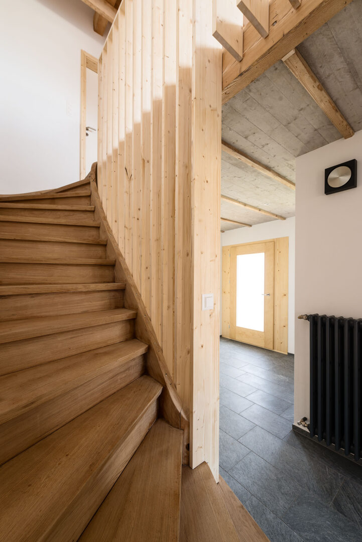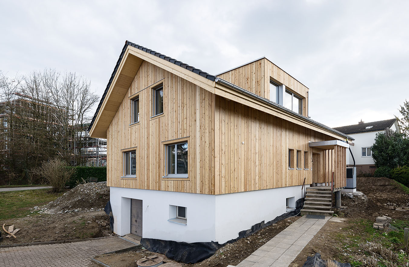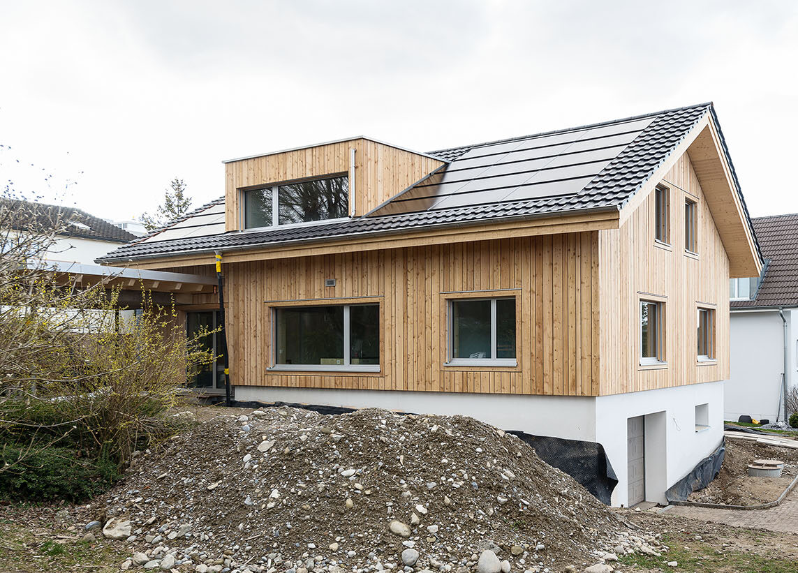 Sanierung des Einfamilienhauses aus dem Jahr 1955 in Muri AG mit inneren Umbauten und Anpassungen der Raumstruktur, neuen Badzimmern und Küche. Energetische Sanierung der gesamten Gebäudehülle in Minergiestandard, Ersatz der Ölheizung durch eine Luft/Wasser Wärmepumpe, kombiniert mit PV Anlage (Indach) und Holzspeicherofen im Wohnzimmer. Gesamtheitlicher Ersatz der inneren und äusseren Oberflächen mit natürlichen und nachhaltigen Materialien. Neuer Anbau für den Wohnbereich mit Dachterrasse in Massivbauweise und äusserer Horizontalschalung.