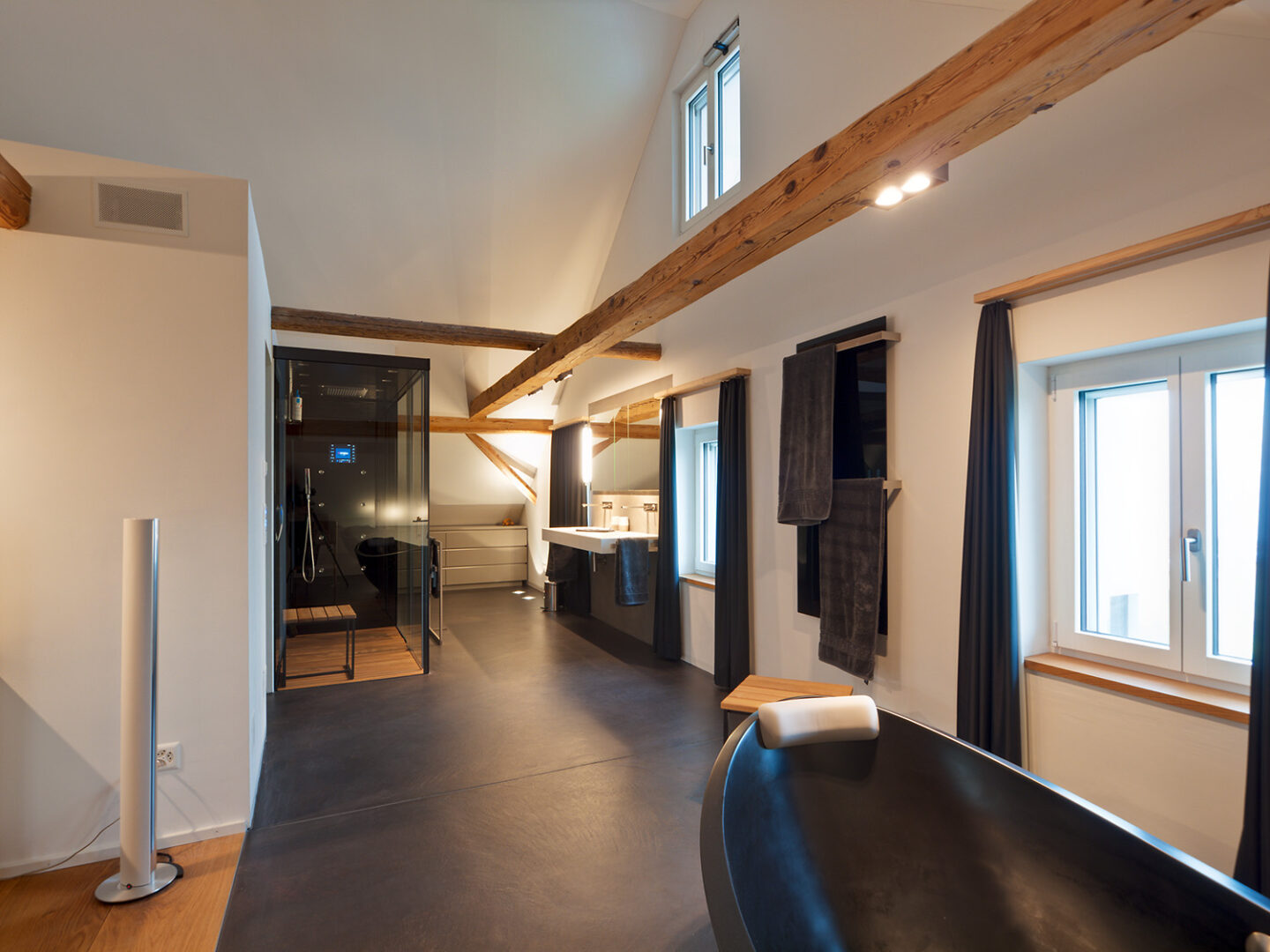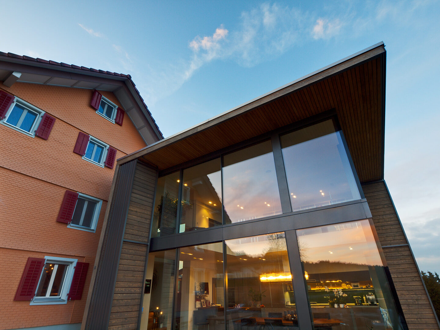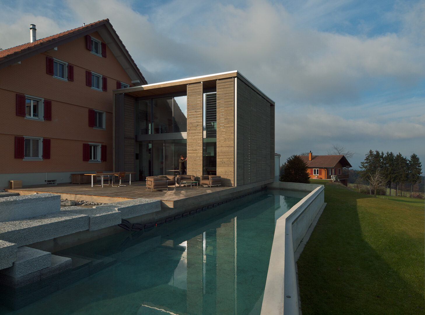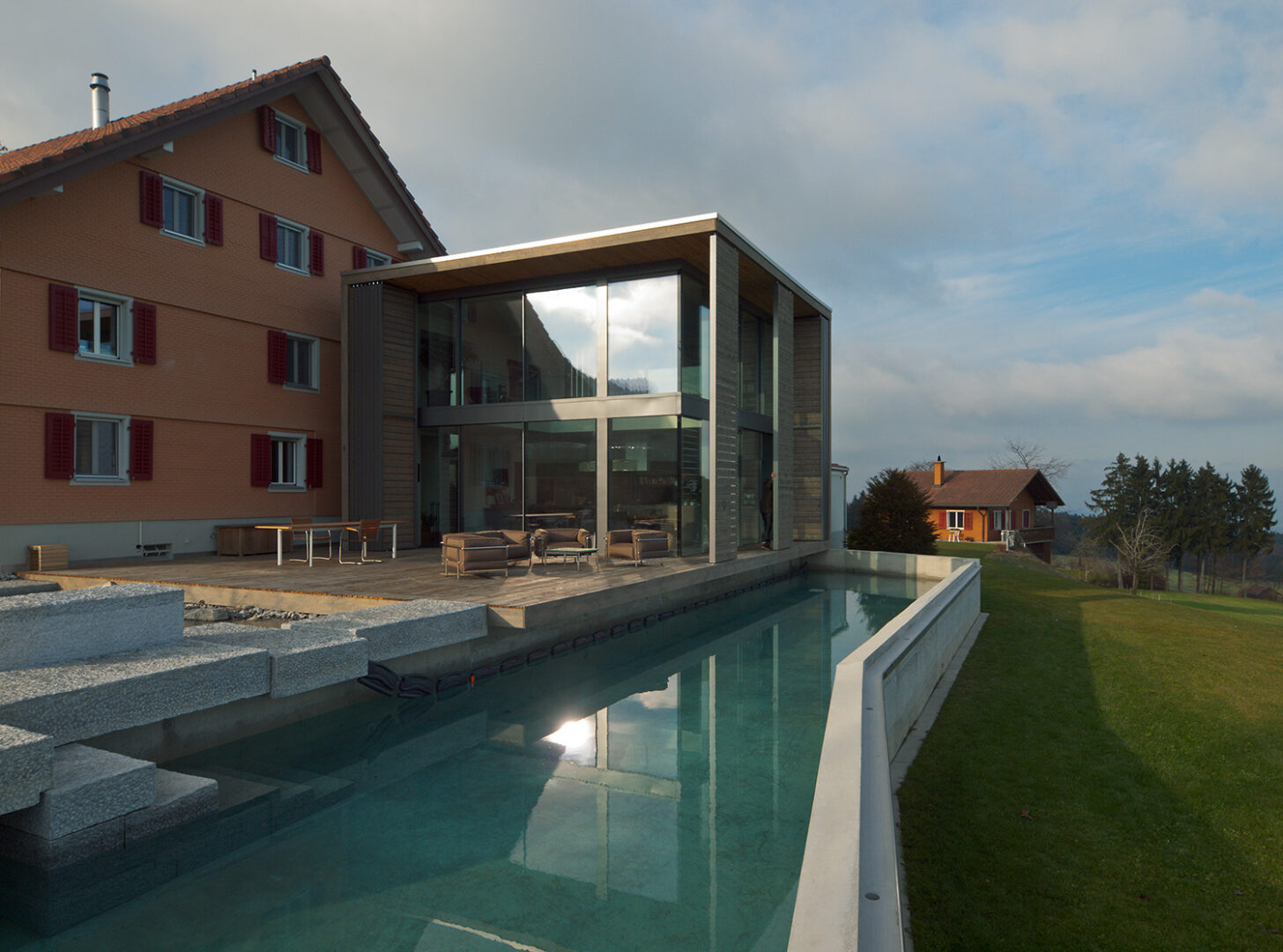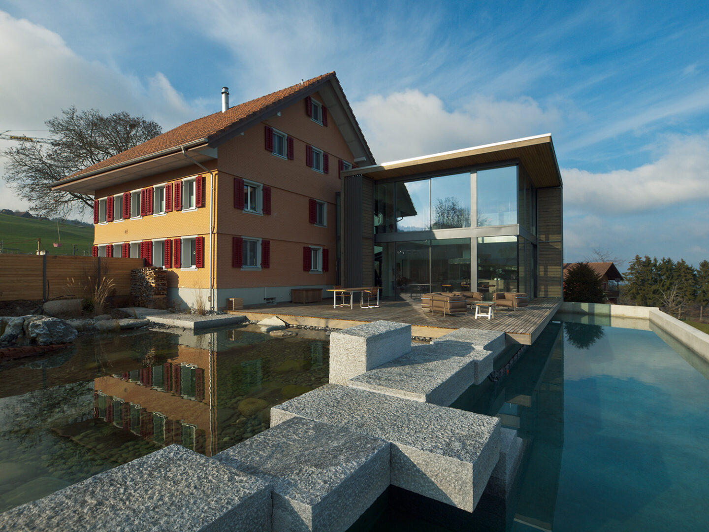 Umbau und energetische Sanierung des Schutzobjektes aus dem 18. Jahrhundert im Weiler Brunnwil. Abbruch und Ersatzbau des talseitigen ehemaligen Wirtschaftsgebäudes und Umnutzung des Schweinestalles zur Dreifachgarage.