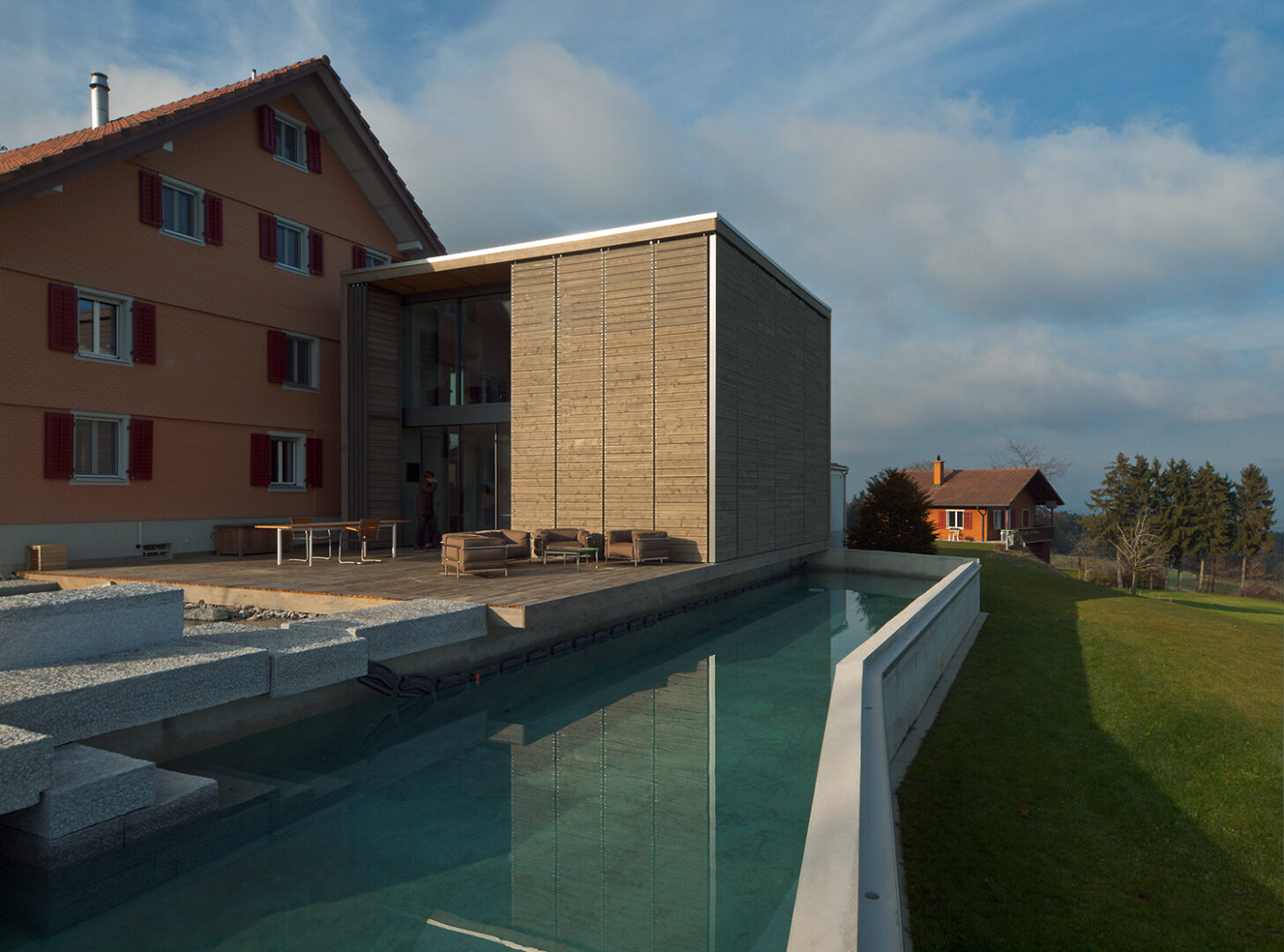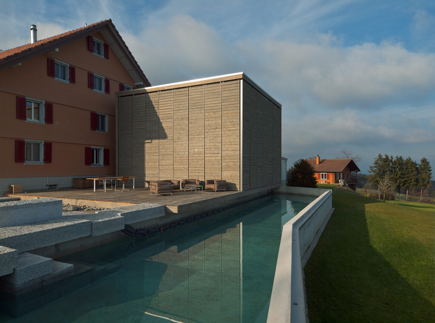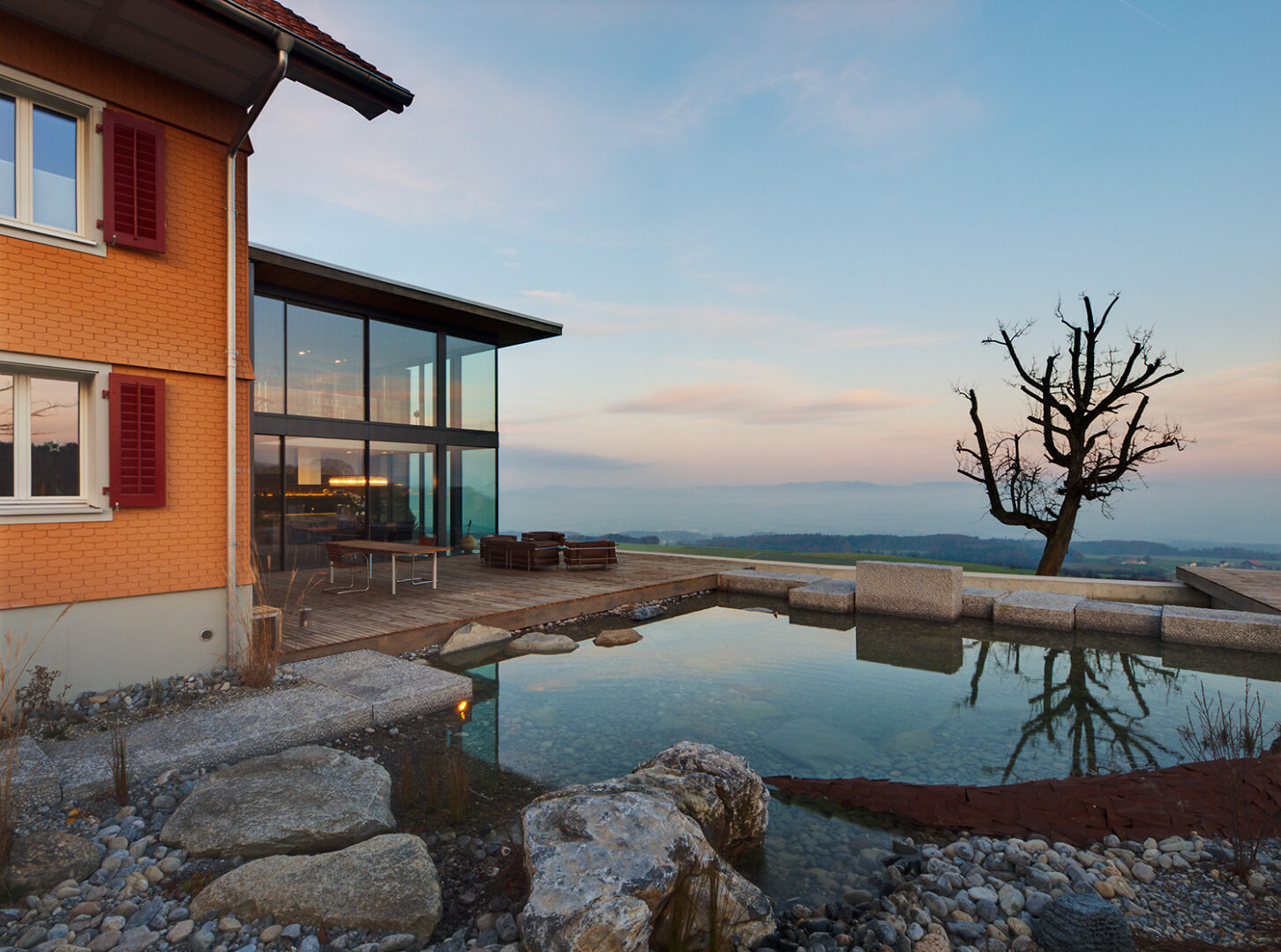 Schwimmteich in Sichtbeton mit Filter- und Regenerationsbereich.