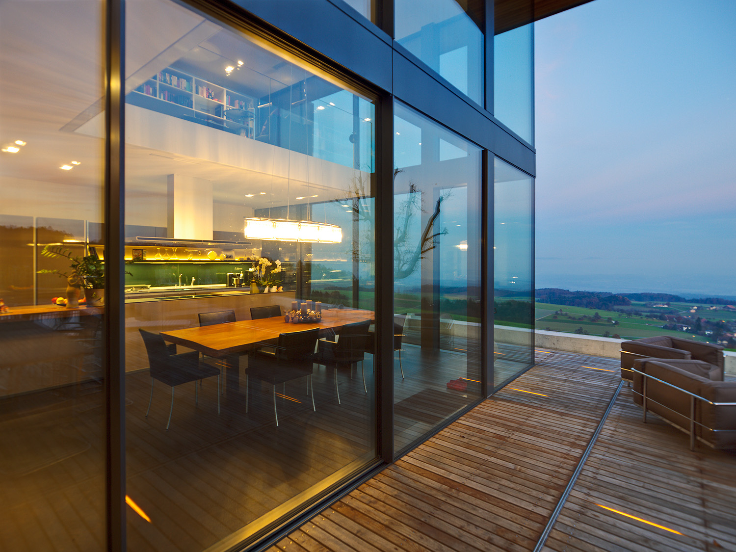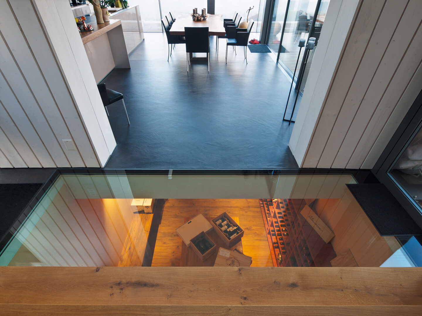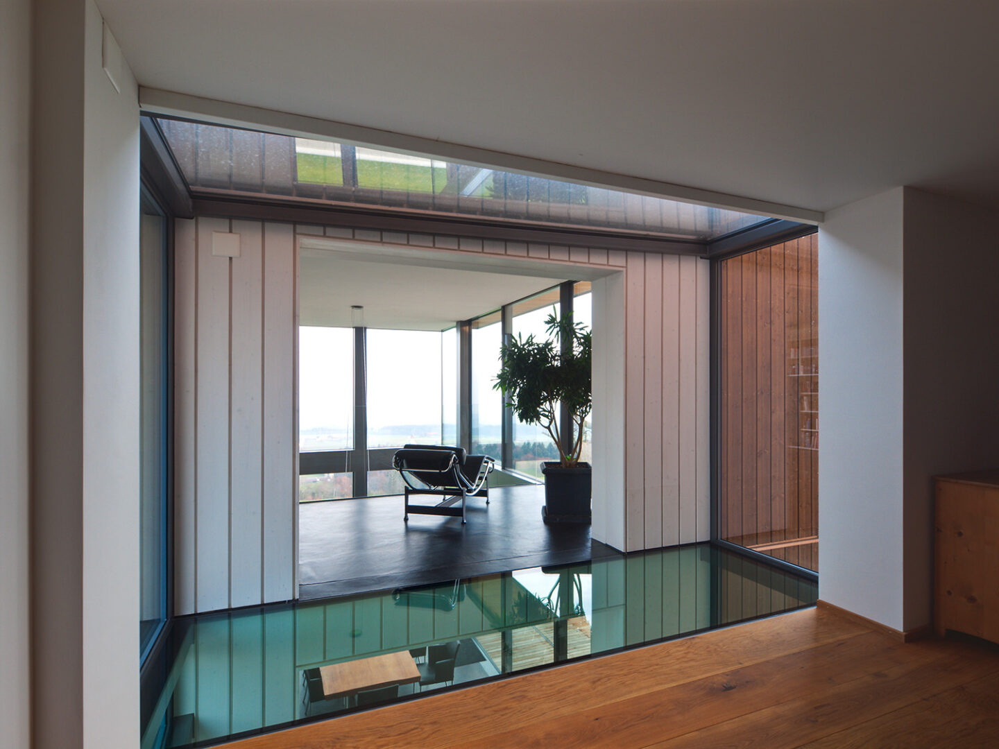 Schwimmteich in Sichtbeton mit Filter- und Regenerationsbereich.