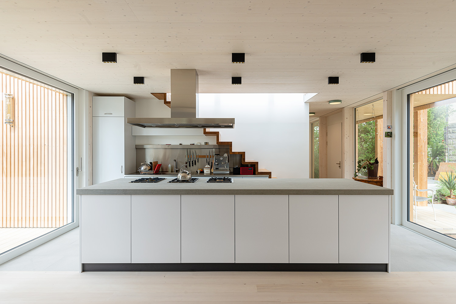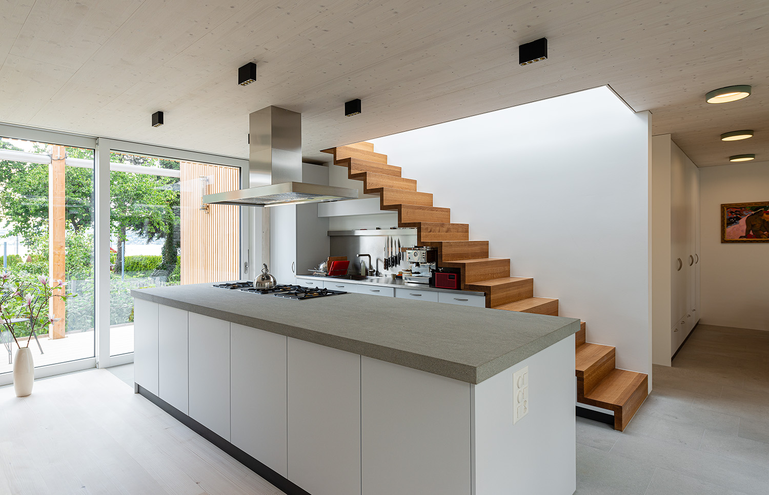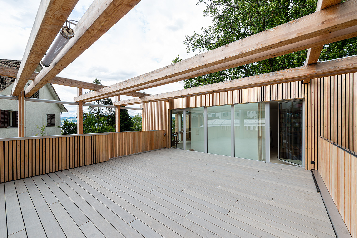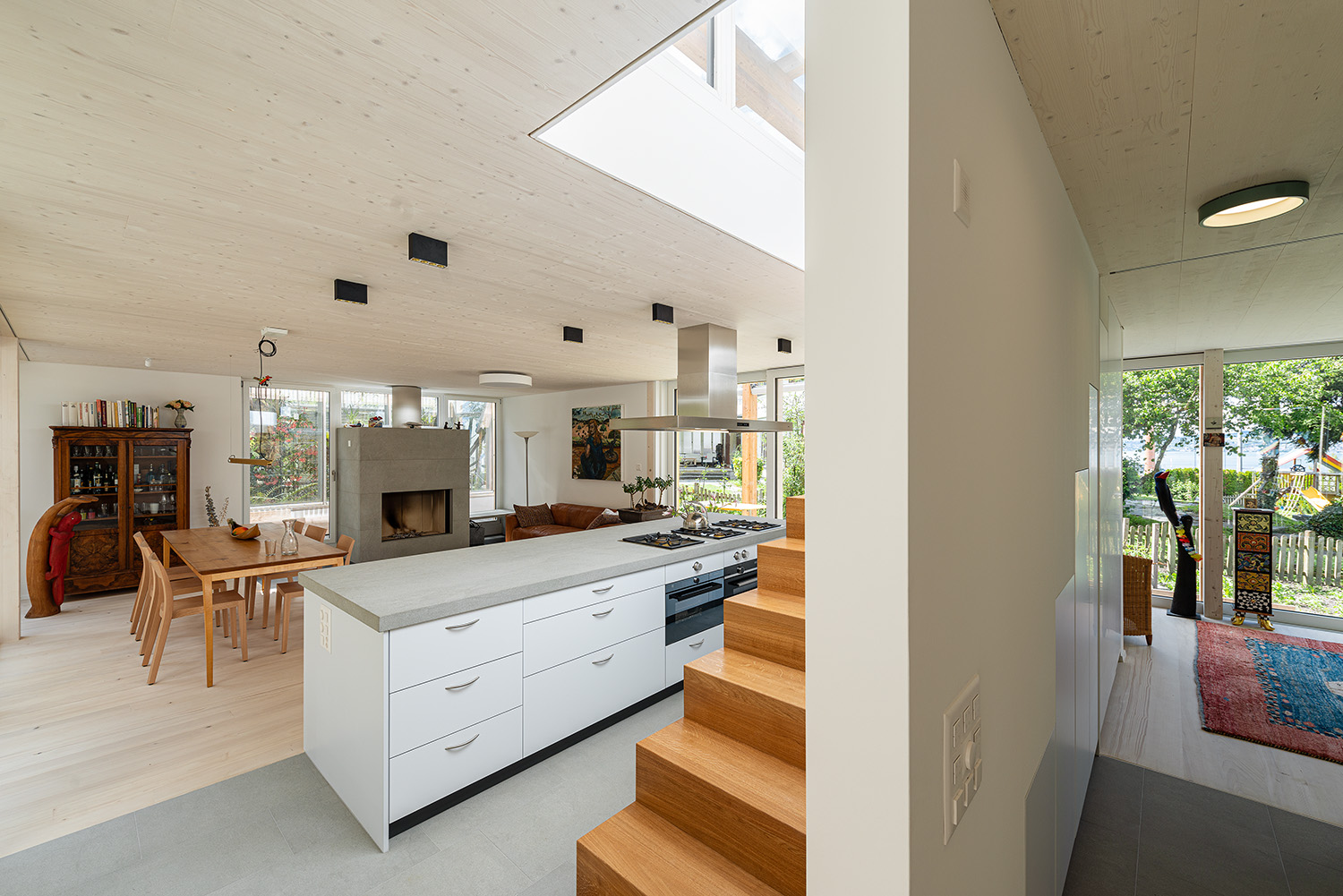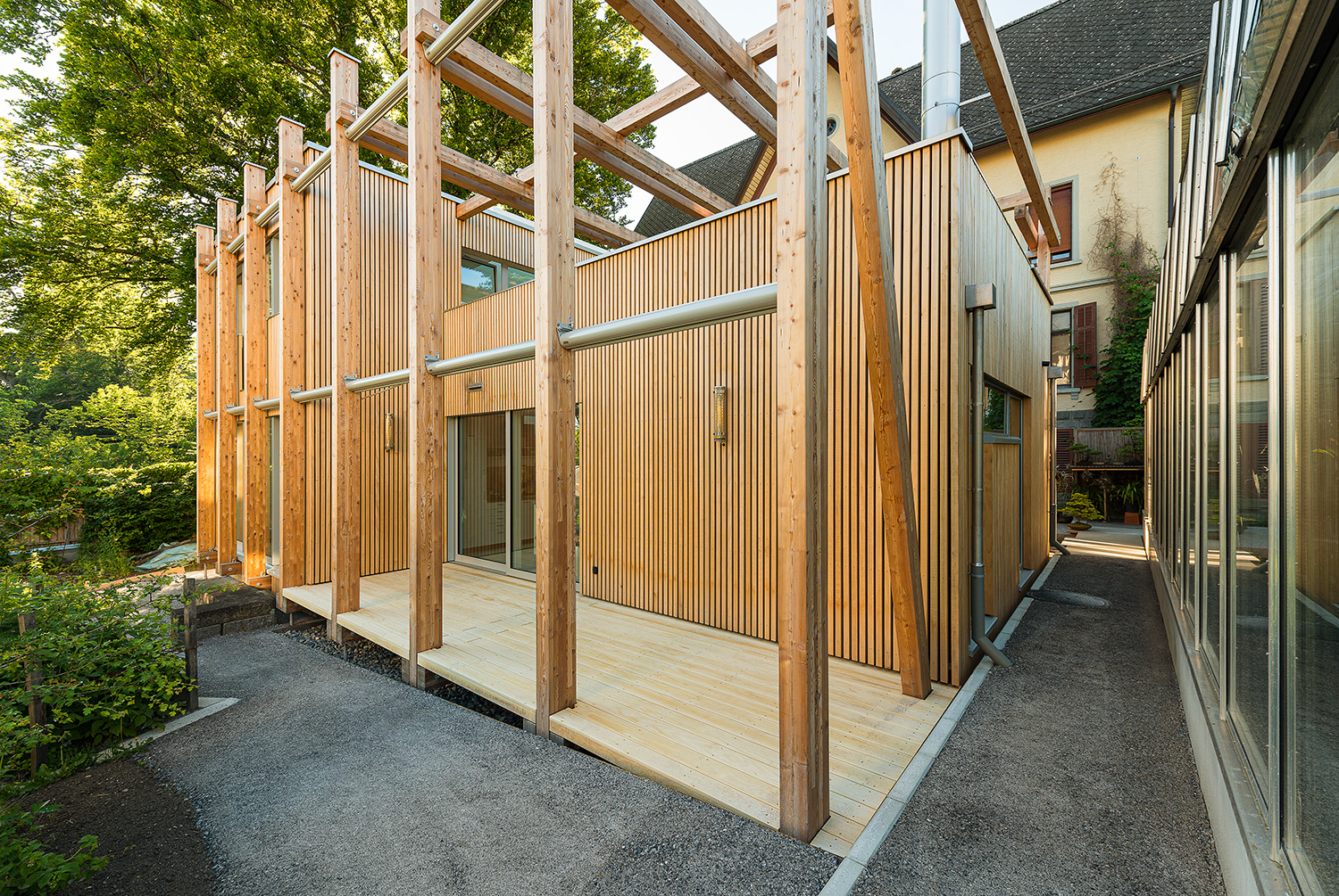 Da der Pflanzenbestand erhalten und die Eingriffe in der Nahumgebung des Gebäudes auf ein Minimum reduziert werden sollen, erhält der Neubau keine Unterkellerung.