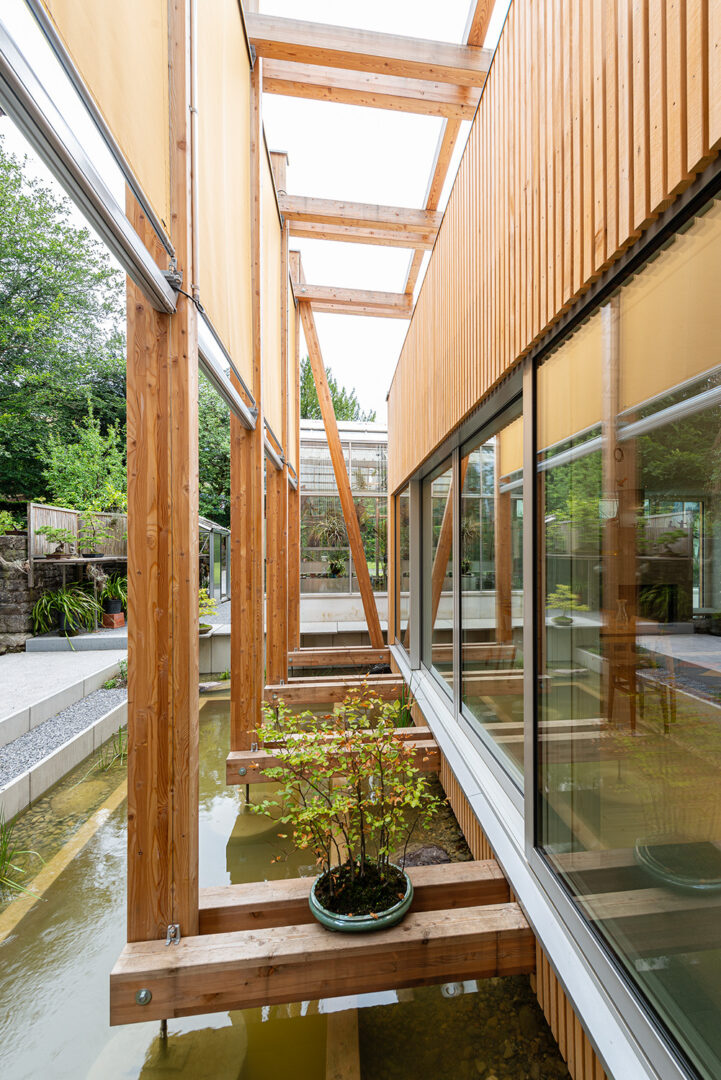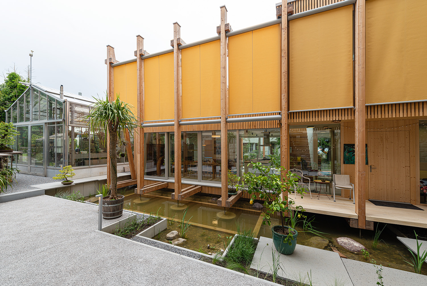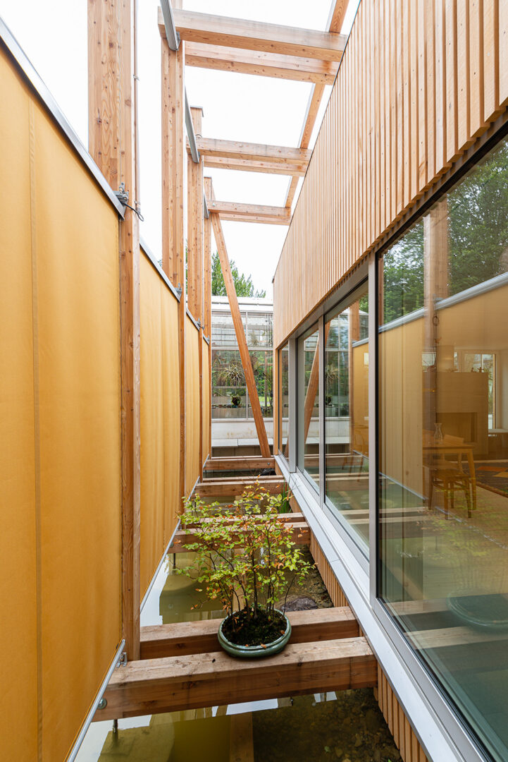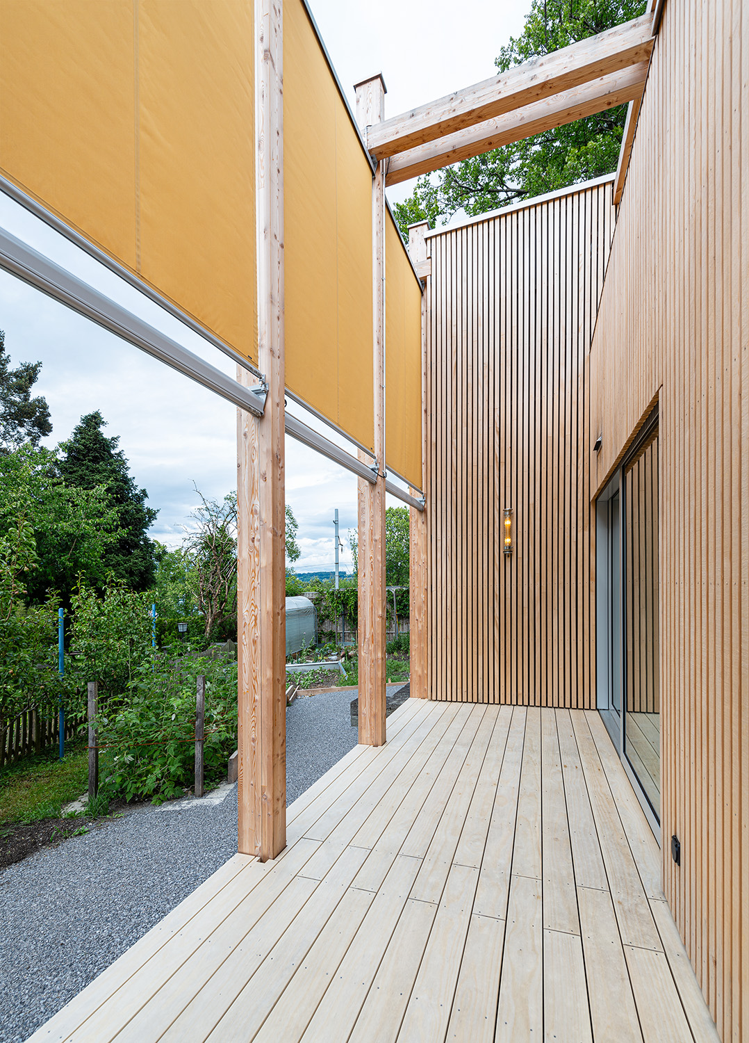 Neubau eines Gartenpavillons in Holzbauweise zu Wohnzwecken im teilweise historischen Garten der denkmalgeschützten Fabrikantenvilla. Die Wohnräume sind auf zwei Geschossen angeordnet, wobei sich im Erdgeschoss die Hauptwohnräume und im Obergeschoss die privaten Räumlichkeiten befinden.