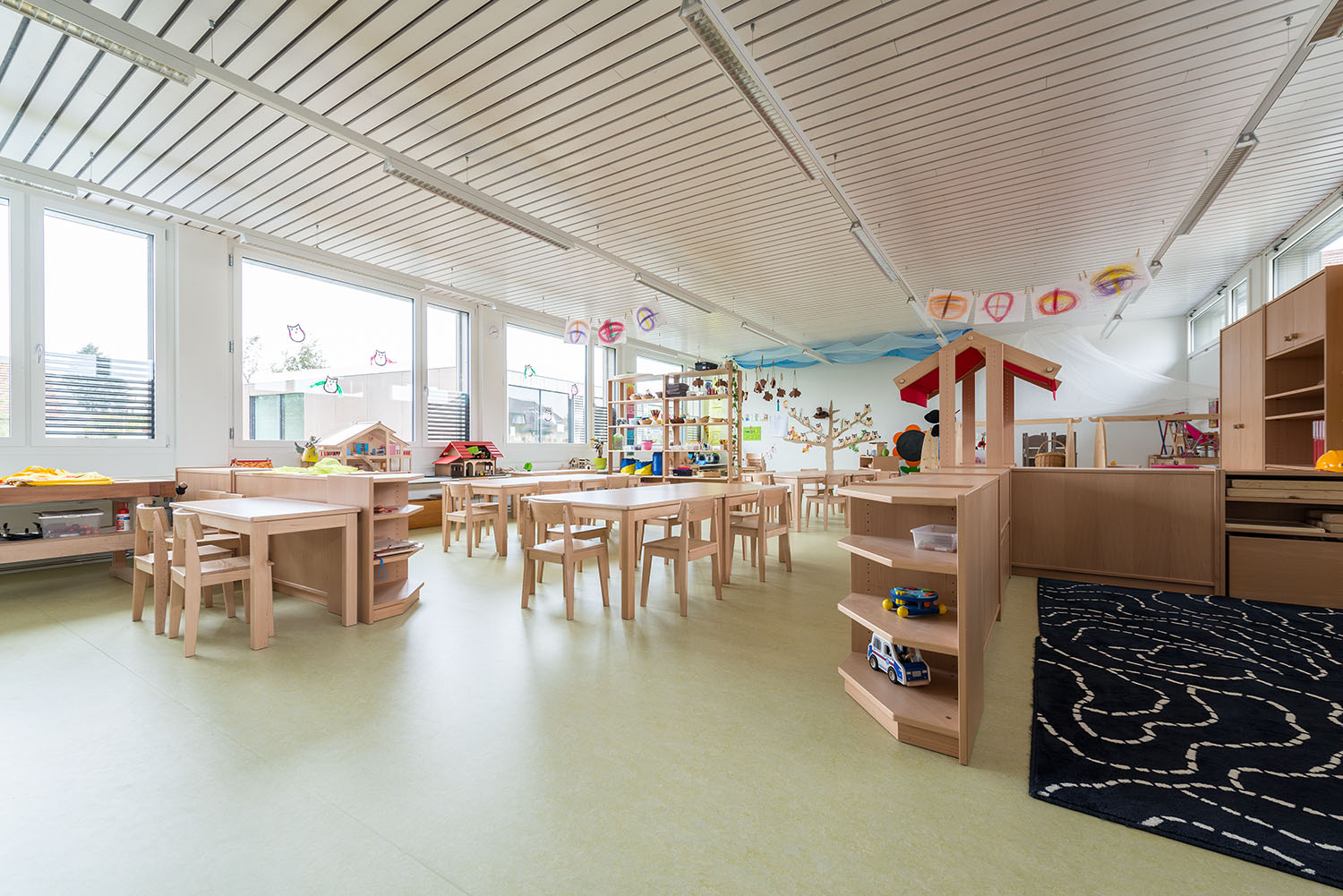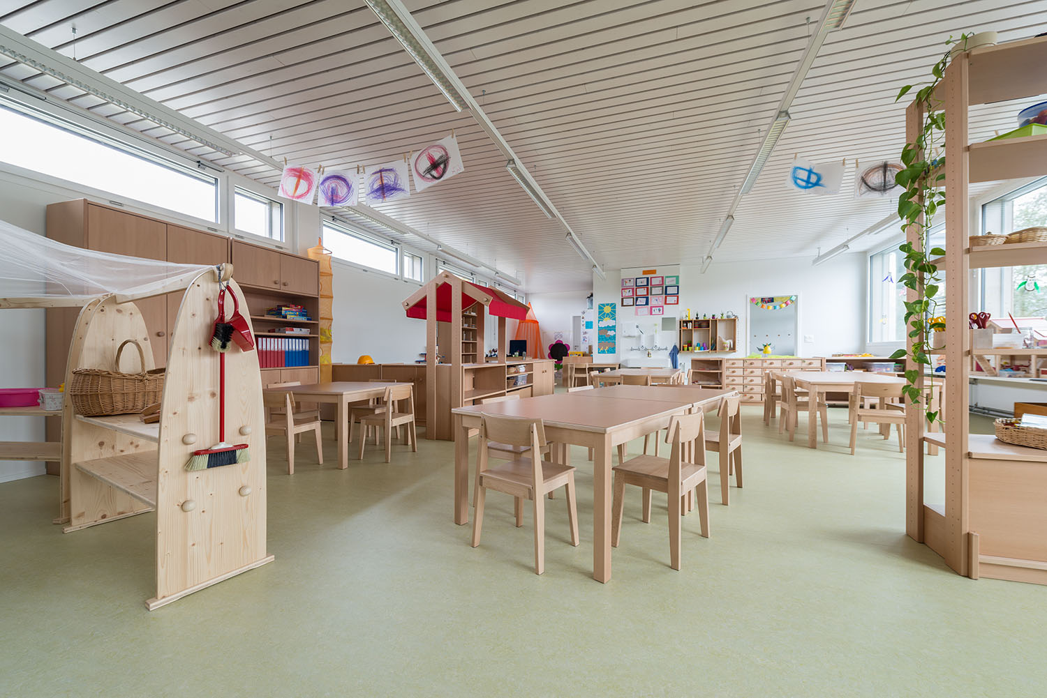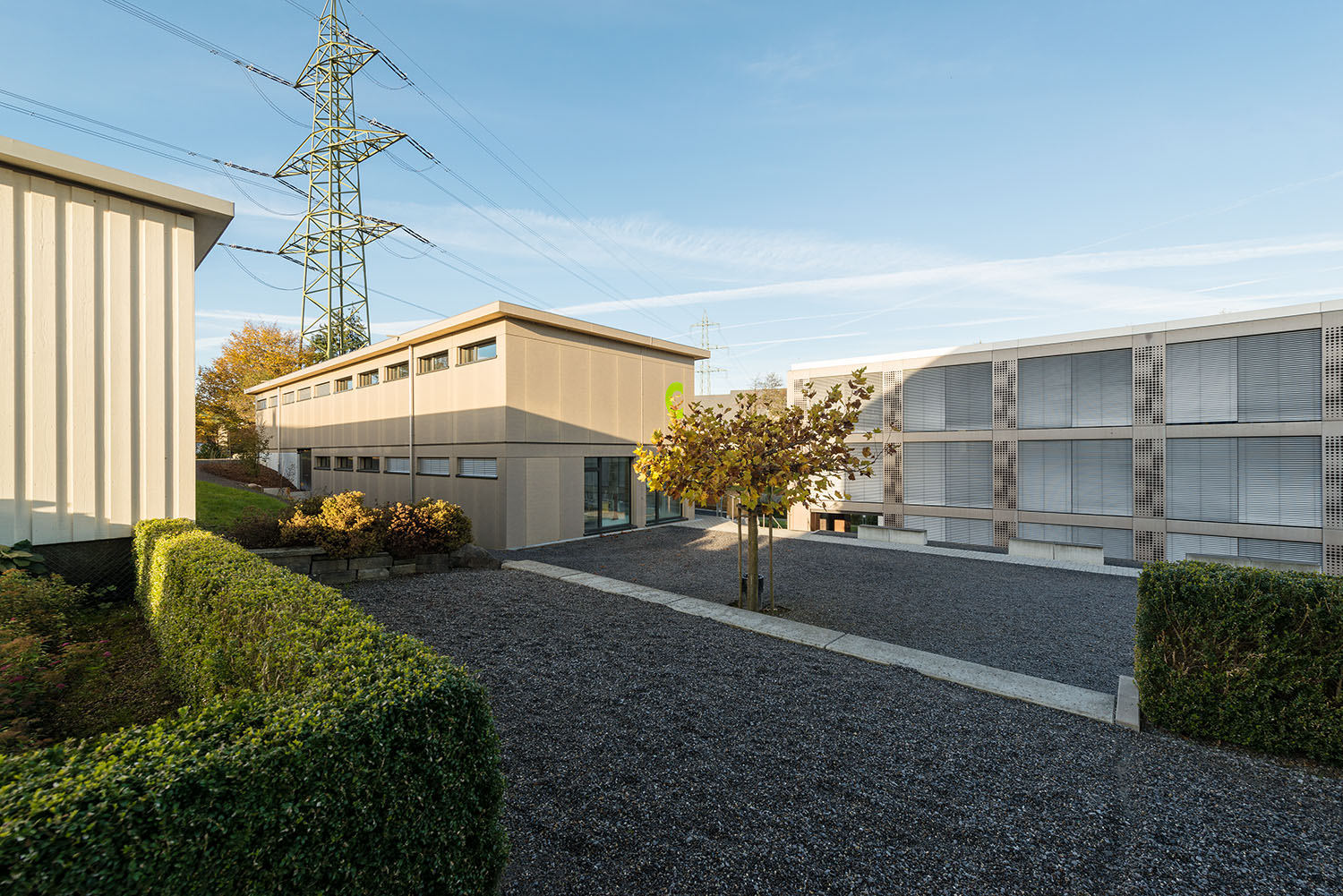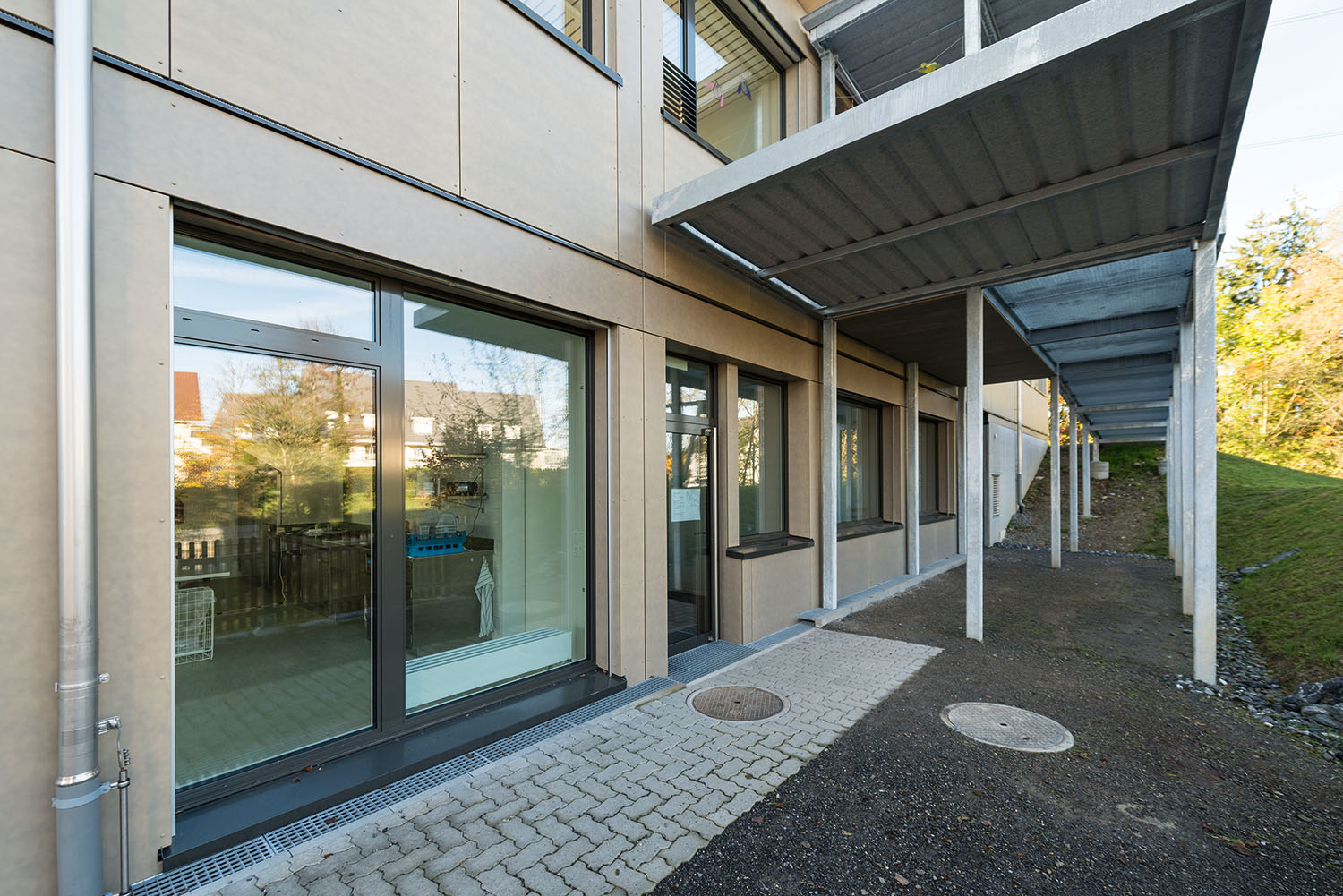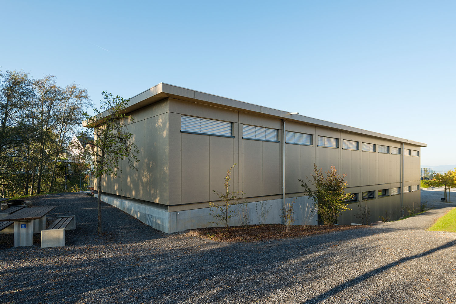Modulare Raumerweiterung auf dem Schulareal Samstagern in Holzelementbauweise in Minergiestandard für das Betreuungsangebot mit Mittagstisch und zwei Kindergärten.
