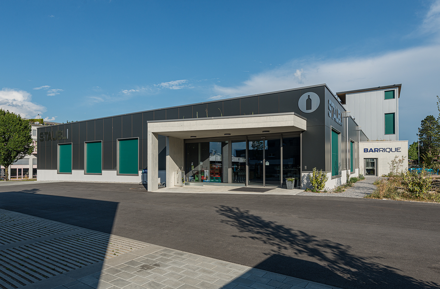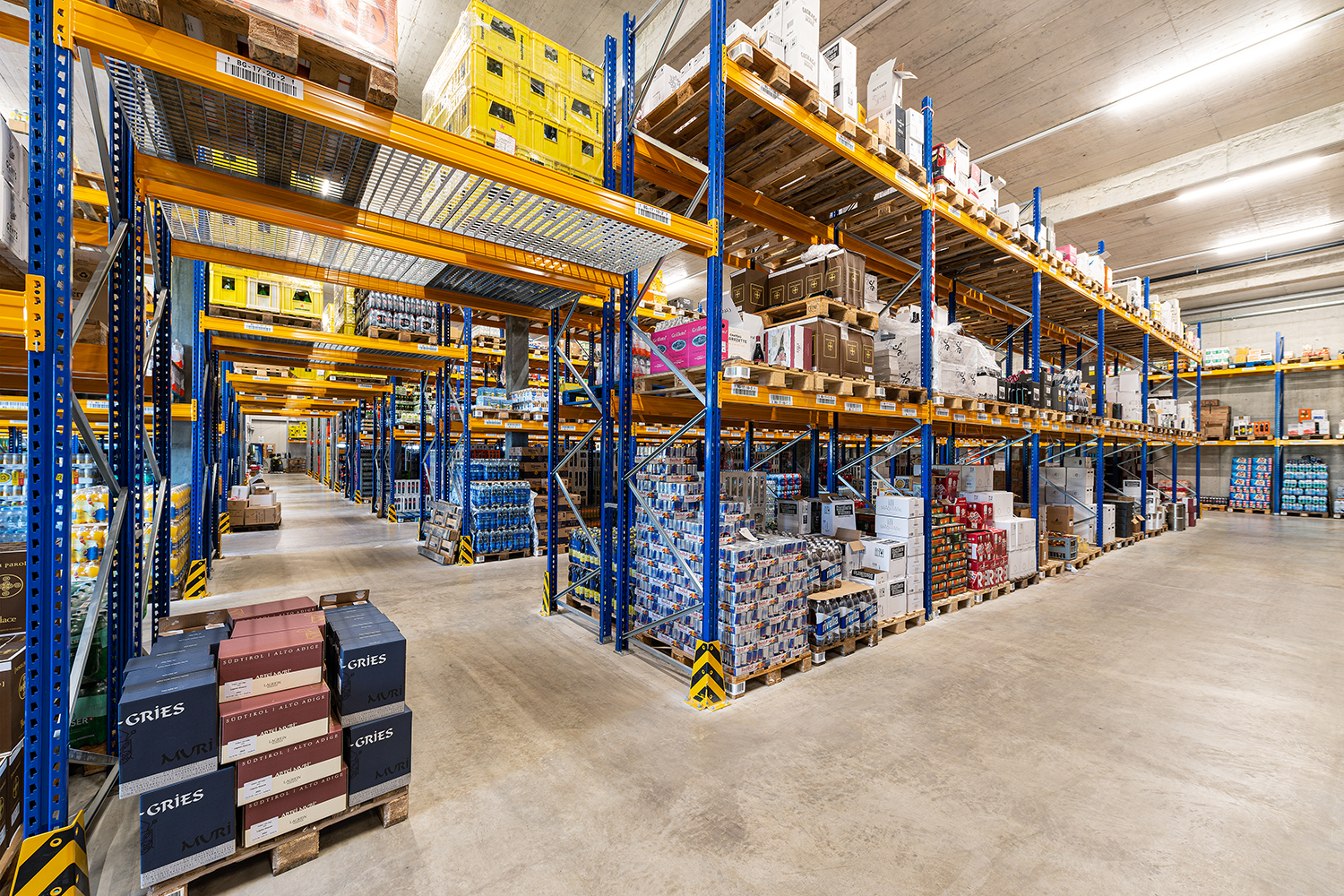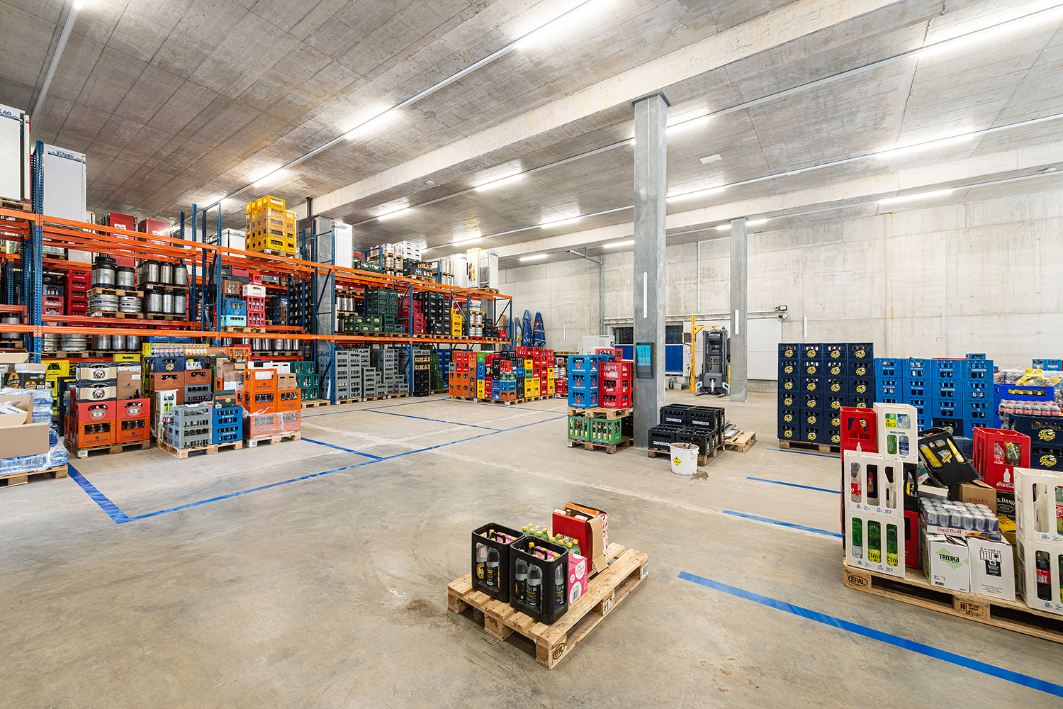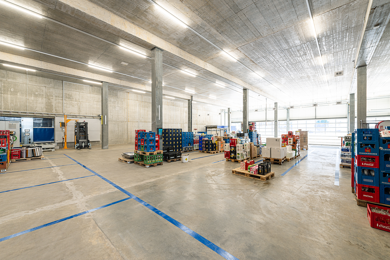 Beton-Stahlbau mit Beplankung aus Sandwichpaneelen mit Platz für 6’000 Palletten und rund 5’800 Verkaufs- und Mietartikel von diversen Getränken bis zu Kühlschränken und Barelementen. Südseitige Photovoltaik-Fassadenanlage.