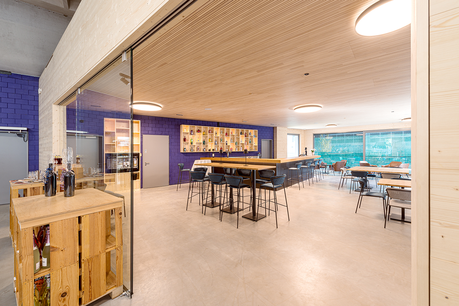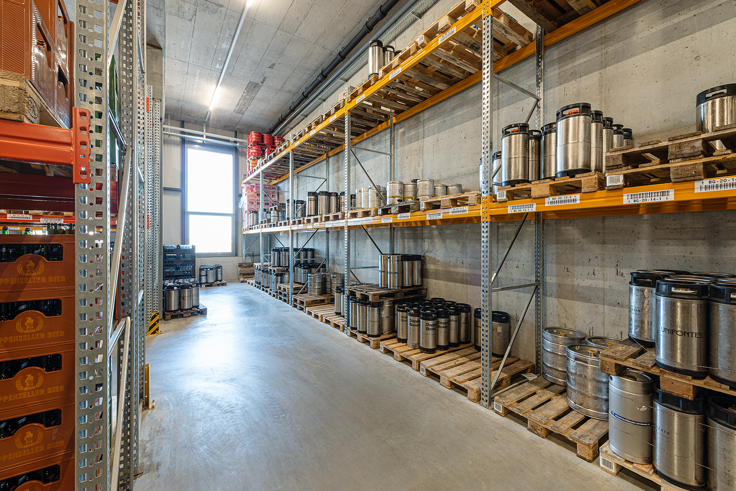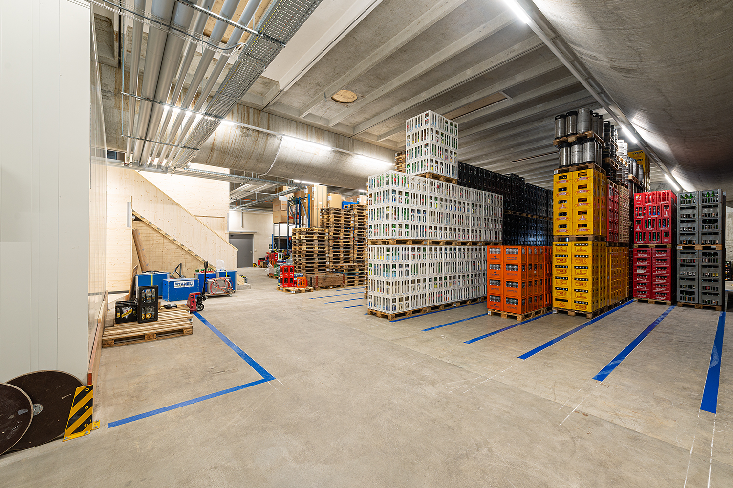 Beton-Stahlbau mit Beplankung aus Sandwichpaneelen mit Platz für 6’000 Palletten und rund 5’800 Verkaufs- und Mietartikel von diversen Getränken bis zu Kühlschränken und Barelementen. Südseitige Photovoltaik-Fassadenanlage.