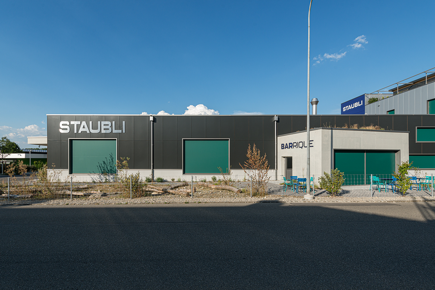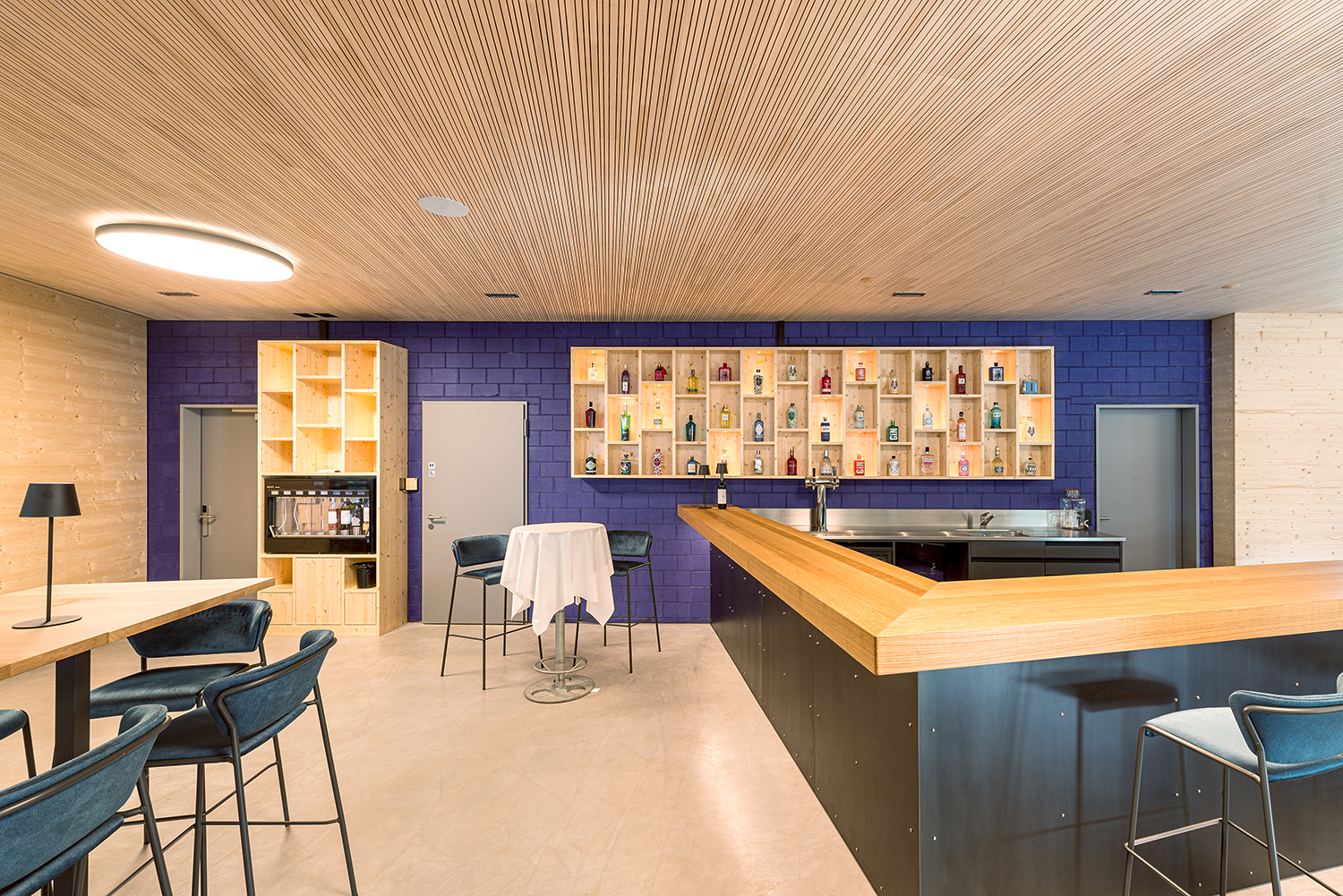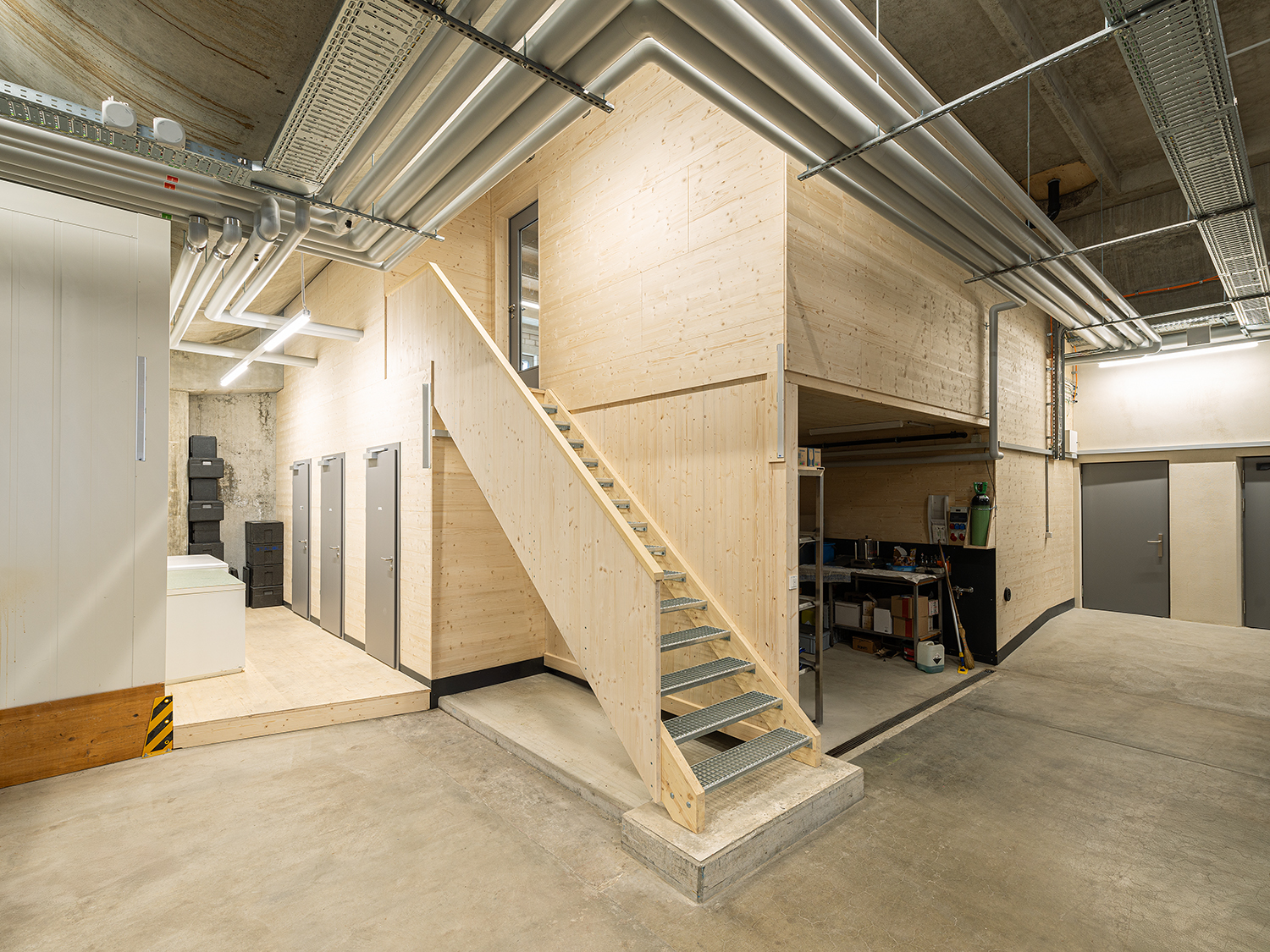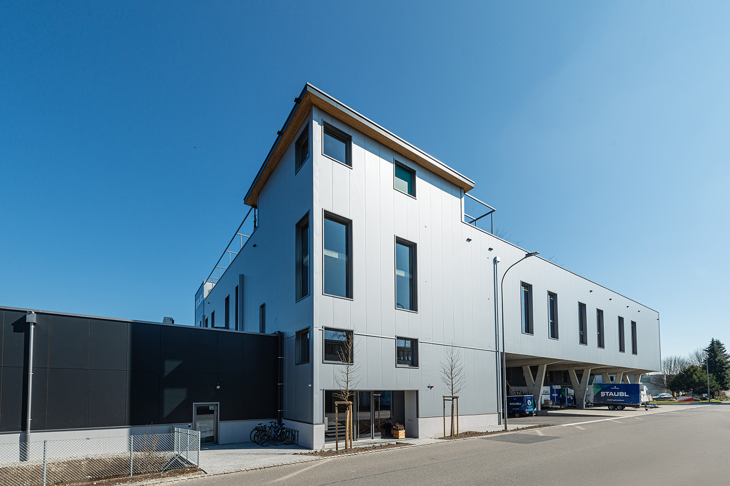 Beton-Stahlbau mit Beplankung aus Sandwichpaneelen mit Platz für 6’000 Palletten und rund 5’800 Verkaufs- und Mietartikel von diversen Getränken bis zu Kühlschränken und Barelementen. Südseitige Photovoltaik-Fassadenanlage.